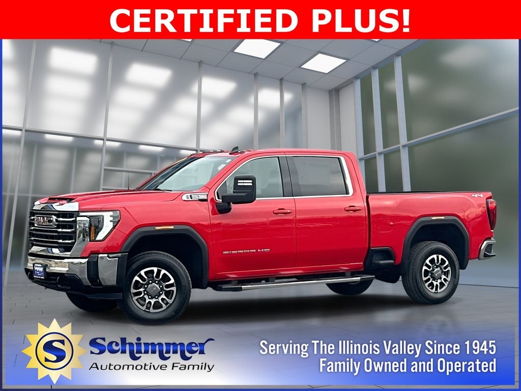 Here's some more details on this Vehicle: Used 2024 GMC Sierra 2500HD SLE in stock at Schimmer Ford Lincoln Hyundai in Peru, Illinois. This used Sierra 2500HD comes in Cardinal Red with Black Cloth. Stock # P1079 and Vin # 1GT49ME75RF137093. 6.6L V8 10-Speed Automatic